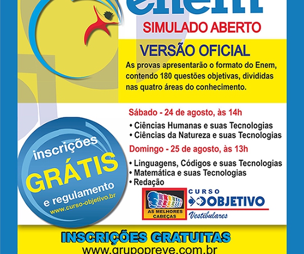 Assim será também o Simulado Aberto do ENEM - Versão Oficial, que será realizado nos dias 24 (14h) e 25 (13h) de agosto.