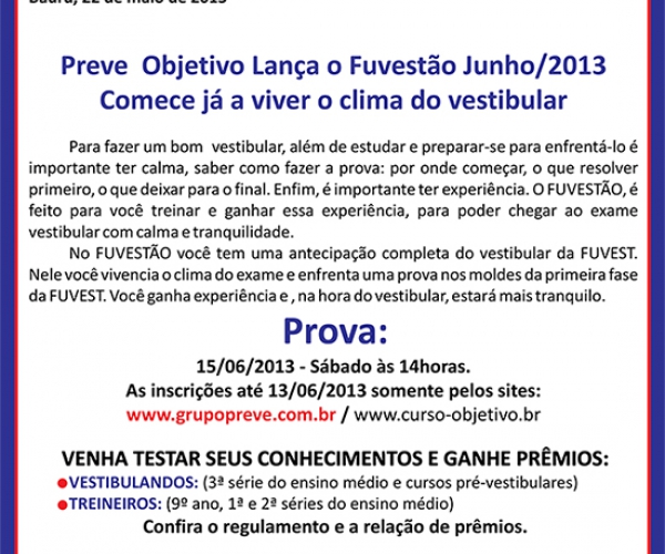 Inscreva-se em: http://www.curso-objetivo.br/concursos/fuvestao.aspx